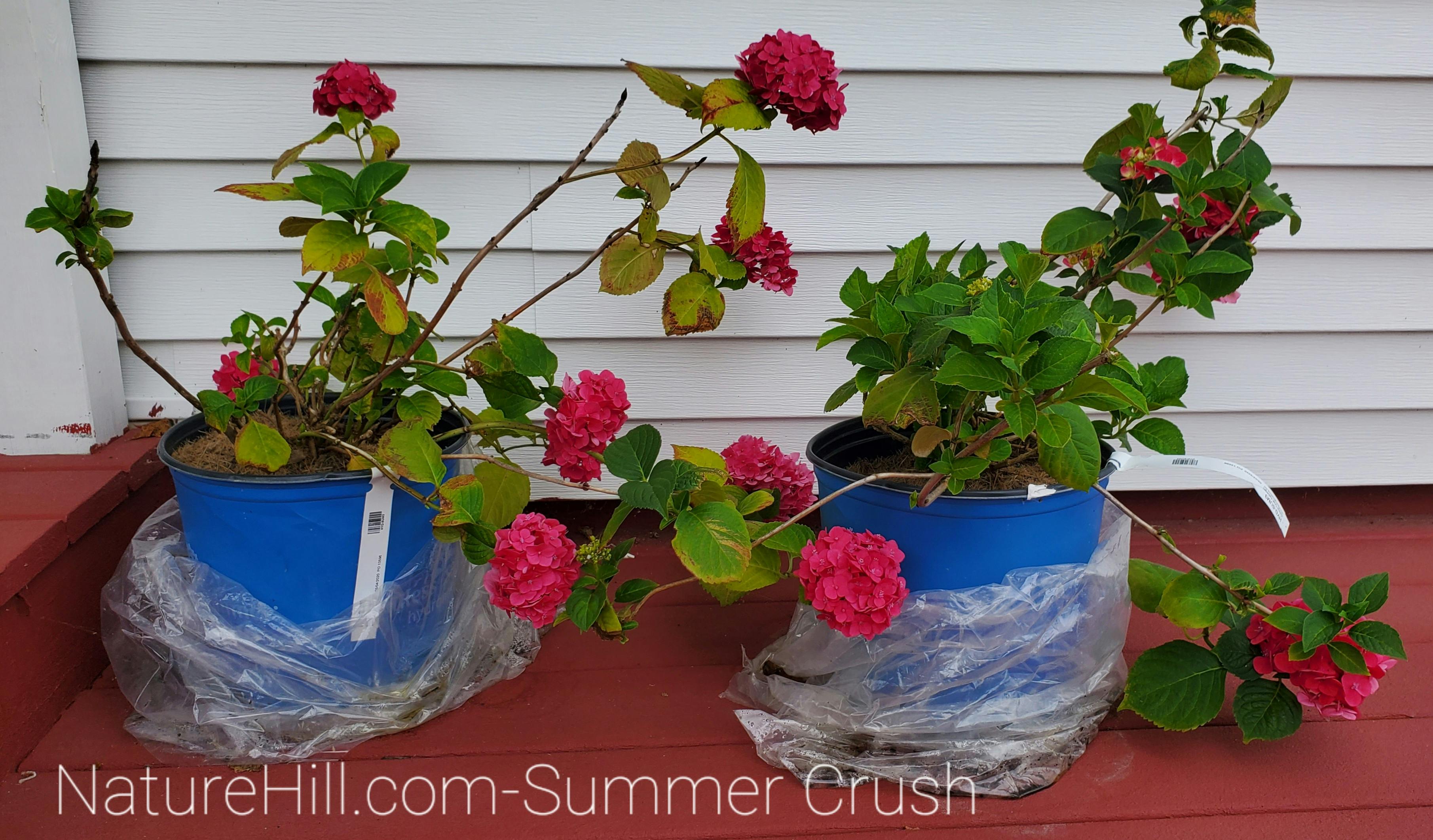 IN THE BLUE POTS ARE NOT GREATGARDEN - I also purchased 2 ea Summer Crush Hydrangea's from NatureHill.com at the same time for 3x the price each. They are currently also in bloom but are tall and lanky - they were tall and lanky when arrived. I overwintered these from Naturehill in their pots in a pole barn because I didn't know where to plant them being so drastically different and the lanky-ness is not what I'm hoping for.